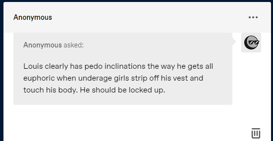 One of the most organized and persistent anti-fans in One Direction fandom is a Harry Styles fan who has spent nearly a decade mocking and denigrating his former bandmates. Following them as closely as a fan account, but with the purpose of railing against them. They also seek out fans, stalking and harassing them, creating sock-puppet accounts to continue to do so after being blocked. I’ve been on the receiving end of their abuse, and had the misfortune of seeing their bizarre rantings. This account is a proactive anti-fan.
