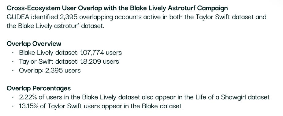 Calling it a coordinated attack implies that there is a specific source behind it. The report insinuates that TAG PR was involved by bringing in Blake Lively. Considering the two of them have overlapping fan bases, and as a result, overlapping anti-fans, it doesn’t surprise me that there’s an overlap in users, but it’s a much smaller overlap than I would expect.