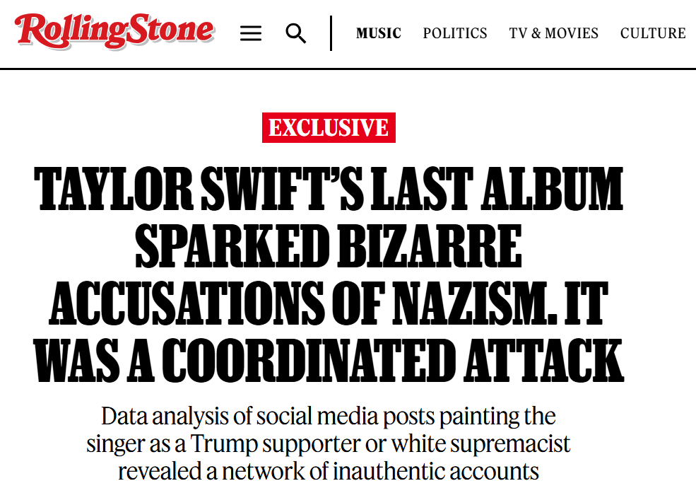 Last week, Rolling Stone published an exclusive on a report from AI publicity firm GUDEA that looked at the narrative around Taylor Swift’s latest release, more specifically, the spread of discourse that claimed her latest era was right-wing coded. The report was allegedly spurred on by an in-house Swiftie who thought the spread of the discussion seemed “inauthentic” and RS drew the conclusion that the discussion was “seeded and amplified by a small network of inauthentic social accounts.”