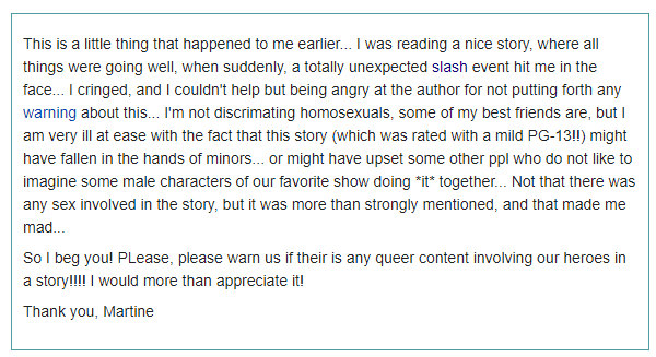 An example of offence taken at a non-explicit slash story below—