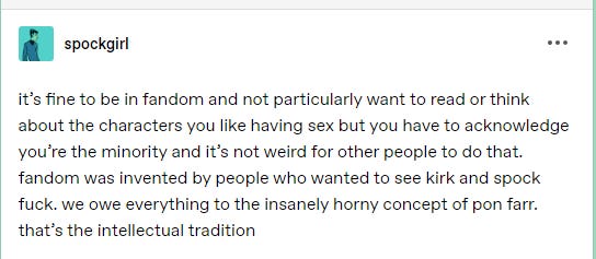 My problem with the claim that “fandom was invented by people who wanted to see kirk and spock fuck” aka slash fans, is twofold: