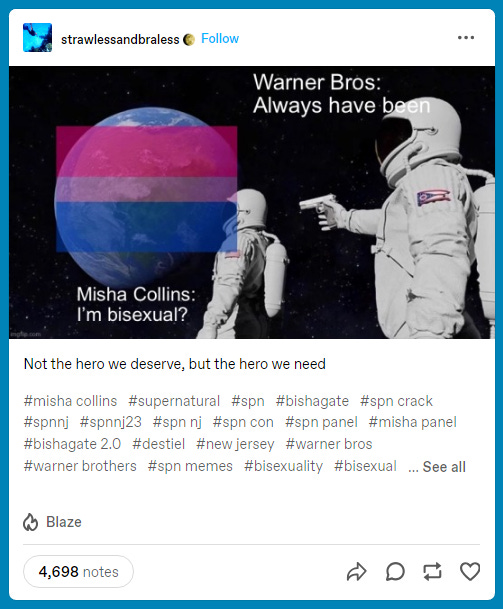 It’s better for business to let the public fight it out and play coy, letting them believe what they want to believe. A notable recent example would be that of Supernatural’s Misha Collins— he “accidentally” came out as bisexual and got on Twitter to walk back his statement.